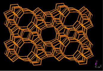 ZSM是Zeolites Socony Mobil的縮寫(xiě),ZSM-5沸石分子篩則是20世紀七十年代美國Mobil石油公司開(kāi)發(fā)成功的一系列新型的高硅鋁比沸石分子篩中其中的一種。它有著(zhù)獨特的交叉孔道結構,都是10氧環(huán)組成,其直筒型孔道呈橢圓形,橫向孔道截面近似于圓形,孔口尺寸稍有區別。一組為平行于單胞的a軸,呈“Z”字形具有近似于圓形的開(kāi)孔,其尺寸為0.54×0.56nm;另一組平行于單胞的b軸,為直通道,但為橢圓開(kāi)口,其尺寸為0.51×0.57nm。ZSM-5晶體屬于理想的斜方晶系,其結構參數為a=20.1,b=19.9,c=13.4。